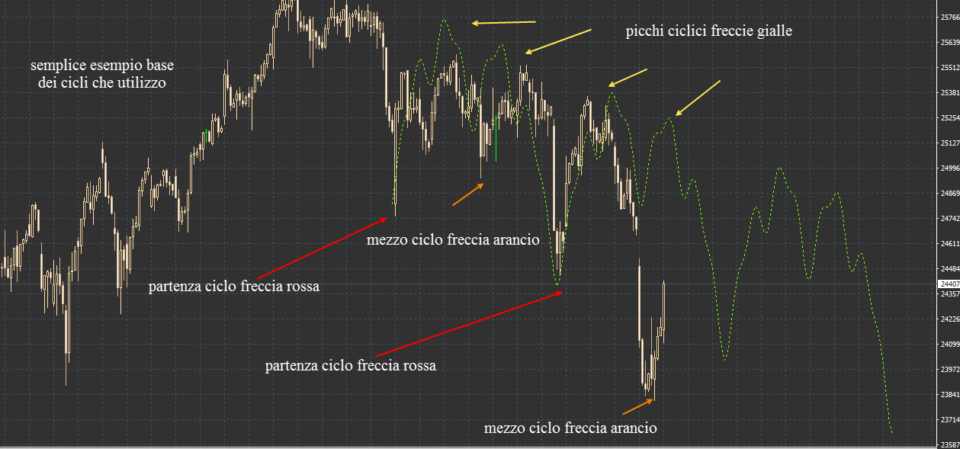 Qui sotto in questa immagine è rappresentato un grafico del nostro indice su time frame h4 dove ho segnato le partenze dei cicli il loro mezzo ciclo e i picchi massimi dei cicli. Solo da questo semplice grafico possiamo subito estrapolare delle info importanti, che quando finisce un ciclo ne riparte uno nuovo, che quando siamo sui picchi del ciclo possiamo valutare dei possibili short sia per il possibile minimo del mezzo ciclo che per il minimo del ciclo completo.